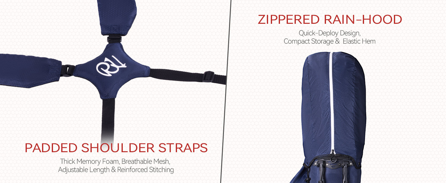 PADDED SHOULDER STRAPS & ZIPPERED RAIN HOOD: Carry your light weight golf bag in total comfort with wide, padded shoulder straps. When the weather turns, simply pull out the included rain hood to keep your clubs dry and protected.