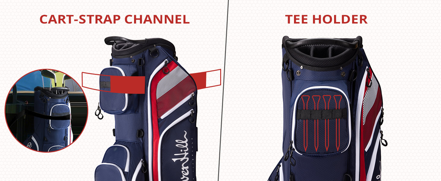 CART STRAP CHANNEL & INTEGRATED TEE HOLDER: Secure your golf cart bag to the cart without sacrificing pocket access. The built-in tee holder keeps your essentials within easy reach for a smoother round.